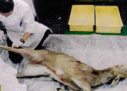 ジビエの解体講習会です。肥田野会長が調理師専門学校の生徒達の前で 本州鹿の解体と野生動物を食する尊さを説く講習会でした。